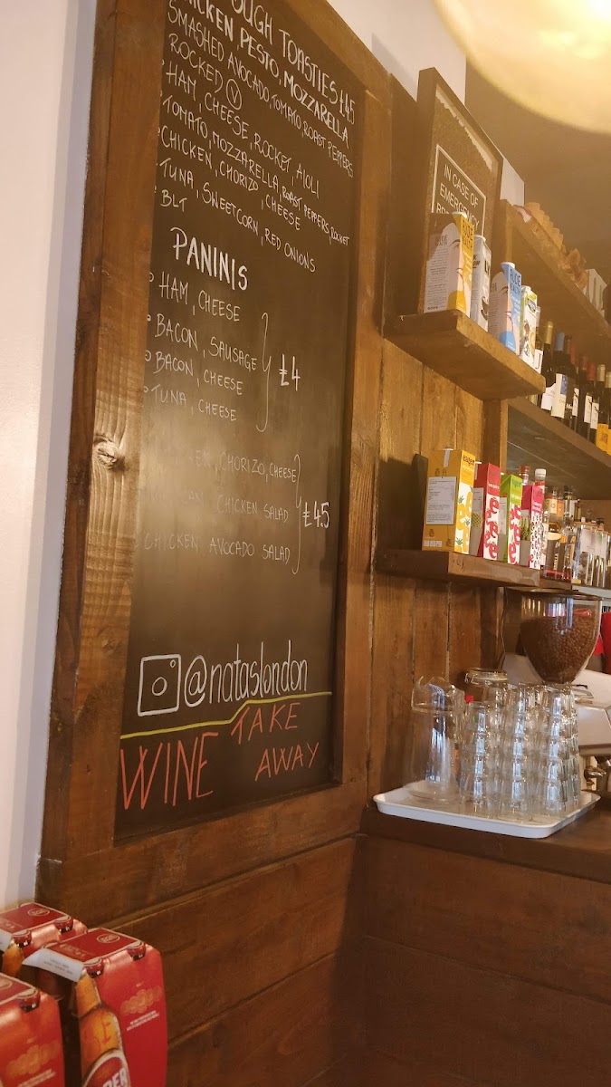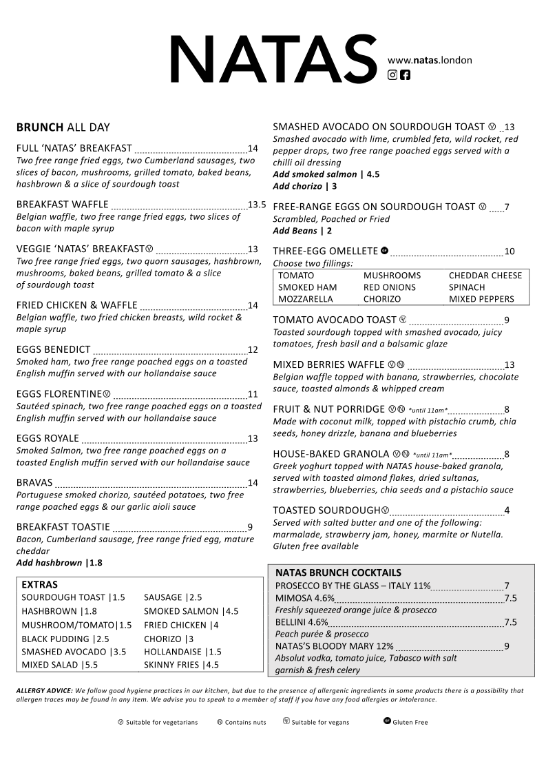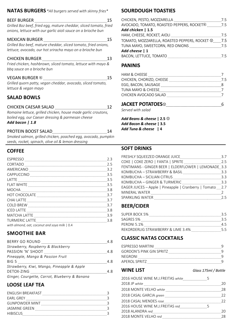 From a reviewer's perspective, the menu at Natas Café Bar - Tooting offers a versatile mix of options that cater to both casual bites and more indulgent meals. Their sandwiches like Cheese & Pickle, Tomato, Mozzarella & Basil, and Ham & Cheese Tuna Sweetcorn Salad are complemented by the hearty Tuna Melt, while pastas such as Tuna Pasta, Carbonara, and Arrabiata showcase comforting Italian flavors. Salad lovers can enjoy the Chicken Caesar Salad, Tuna Salad, or Beetroot Salad, and the jacket potatoes-Tuna And Cheese or Baked Beans And Cheese-make for filling options. For brunch, highlights include the Breakfast Waffle, Full 'Natas' Breakfast, Smashed Avocado On Sourdough Toast, and Veggie 'Natas' Breakfast, with extras like Sourdough Toast, Hashbrown, and Sausage available. Their Natas Brunch Cocktails-from Prosecco By The Glass - Italy 11 to Natas's Bloody Mary 12-add a celebratory touch. The menu also features Natas Burgers including Beef, Mexican, Chicken, and Vegan Burgers, alongside sourdough toasties such as Chicken, Pesto, Mozzarella, Avocado, Tomato, Roasted Peppers, Rocket and Tuna Mayo, Sweetcorn, Red Onions. Paninis like Ham & Cheese, Chicken, and Chorizo, Cheese, Tuna Mayo & Cheese offer warm, melty satisfaction. The salad bowls, particularly the Protein Boost Salad, pair well with the extensive coffee and tea selections-from Espresso and Cappuccino to English Breakfast and Gunpowder Mint. Drinks are rounded out with beer and cider options such as Super Bock 5, Sagres 5, and Peroni 5.1, as well as smoothies like Berry Go Round, Passion 'N' Shoot, and Detox-Zing. Classic cocktails, including Espresso Martini, Negroni, and Aperol Spritz, and wines like 2016 House Wine M.j.freitas or 2018 Monte Velho, complete the menu. Overall, Natas Café Bar - Tooting impresses with a thoughtfully curated selection that balances brunch favorites, international comfort foods, and refreshing beverages, making it a versatile spot for any time of day.